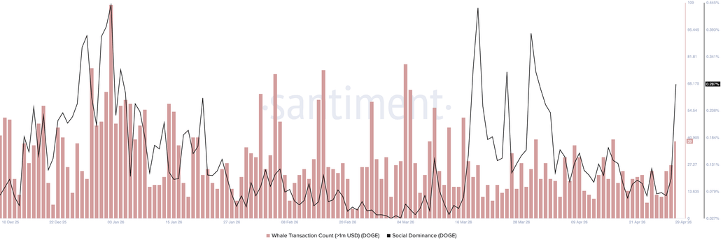 随着市场整体关注度转向网络迷因币,狗狗币(Dogecoin)正走强。Santiment 数据显示,散户投资者对狗狗币的兴趣日益浓厚,其社交媒体占比从前一日的 0.128% 上升至 0.287%。这表明,作为历史最悠久的网络迷因币,狗狗币在社交媒体上的热度激增,这也支撑了其近期的上涨势头。