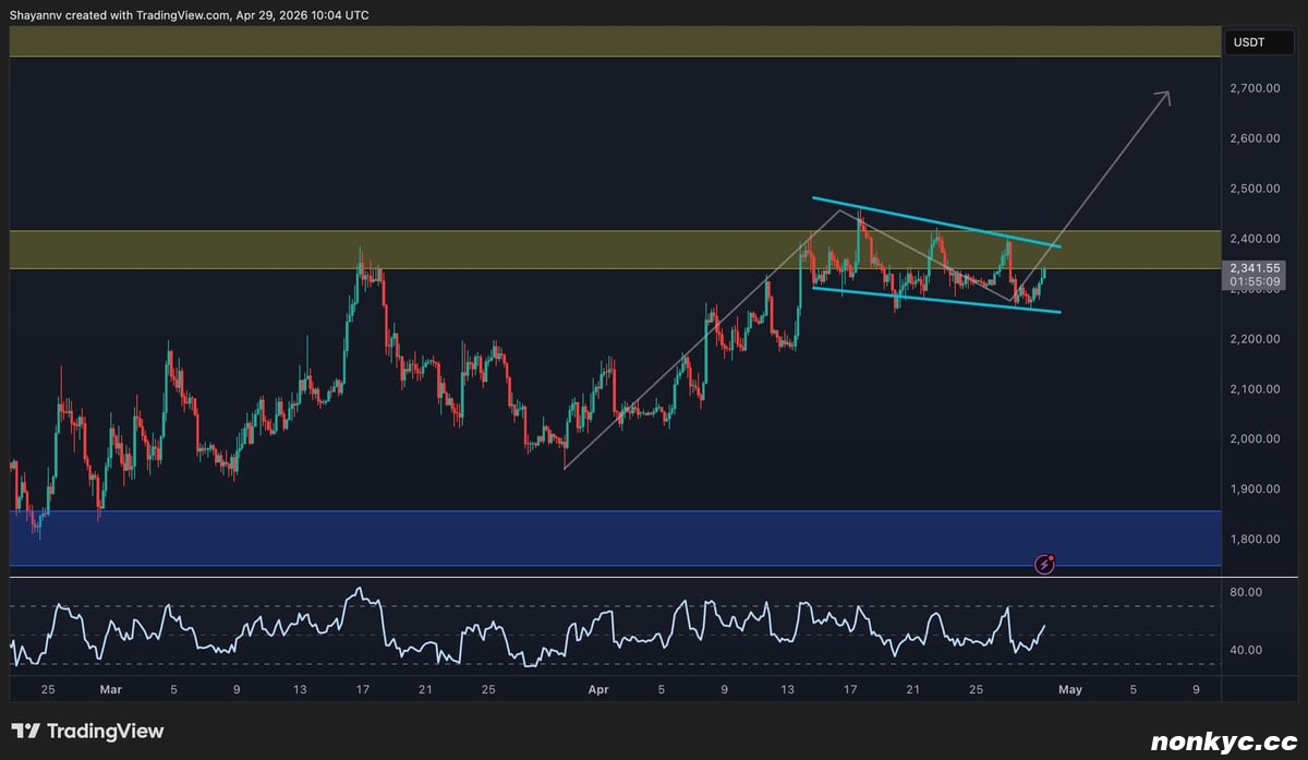 以太坊在四月收盘时交易价格为 2,340 美元,悄然完成了近六个月来一直未能完成的任务:突破了自 2025 年 10 月以来构成其整个调整结构的下降通道。此次突破是新近发生的,在高时间框架上尚未得到确认,并且发生在 2,400 美元阻力区下方。