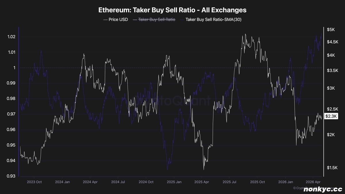 所有交易所的Taker买卖比率30日移动平均值飙升至1.02,创下自2023年底以来的最高水平。该比率及其30日简单移动平均线均同步攀升,且价格正逼近2400美元的阻力位。历史数据显示,高于1.0的读数通常预示着持续的上涨势头,这预示着短期走势乐观。