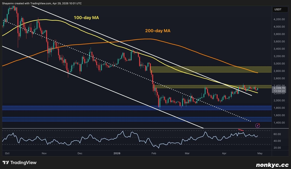 当前最直接的上方考验是 2400 美元的水平供应区,自 3 月中旬以来,以太坊 (ETH)每次试图突破该区域都会遭到拒绝。如果日线收盘价能够顺利突破该区域,这将是本轮周期中第一个真正的结构性转变,并打开通往 2800 美元阻力区的道路,该区域也是 200 日均线的所在地。下行方面,重新形成的通道边界和 2200 美元附近的 100 日均线构成了新的防线。
