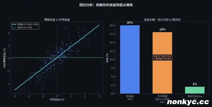 更惨的是,如果你的策略只是在「追涨杀跌」,那在剔除了大盘波动之后,你的 Alpha 可能变成了零甚至是负数。这说明你的所谓「交易优势」,只不过是伪装起来的随波逐流罢了。