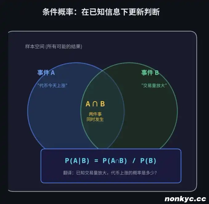 假设你在交易一个「某某代币今天是否会涨」的合约。历史数据显示,这个代币每天上涨的概率是 60%。这就是基础概率(Base Rate)。但是,如果今天该代币的交易量超过了历史平均水平,它上涨的概率会变成 75%。