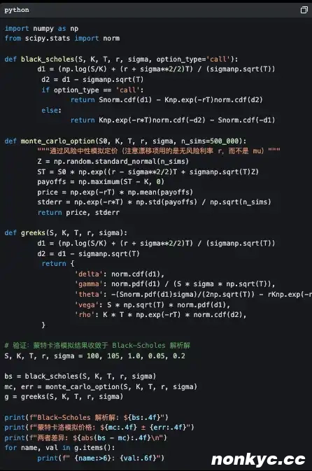 6. 编程练习:从零实现 Black-Scholes 公式定价,再用蒙特卡洛模拟定价,比较两者结果,验证蒙特卡洛随模拟次数增加而收敛到解析解。