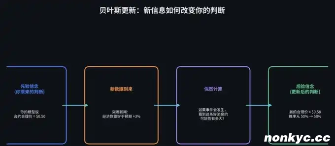 通过贝叶斯公式,你可以精确计算出你的新信念。假设算出来是 58%。那你的新合理价格就是 $0.58。