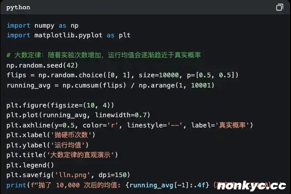 2. 编程练习 1:模拟 10,000 次抛硬币,用图表直观验证「大数定律」。