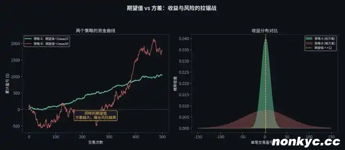 举个例子。假设你有一个策略,每笔交易的期望收益是 $2,但标准差是 $50。这意味着虽然你「平均」每笔赚 $2,但单笔交易的结果可能在亏 $100 到赚 $100 之间剧烈波动。如果你的本金只有 $200,你可能在「长期」到来之前,就已经连亏三把爆仓出局了。