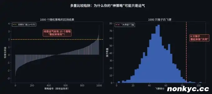 写交易策略也是一样。如果你用电脑自动生成了 1,000 个瞎蒙的策略去跑历史数据,纯靠运气,也会有大约 50 个策略看起来能赚大钱。