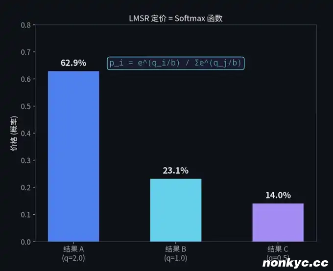 如果你懂一点机器学习,看到 LMSR 的价格计算公式,你会立刻惊呼:这不就是 Softmax 函数吗!